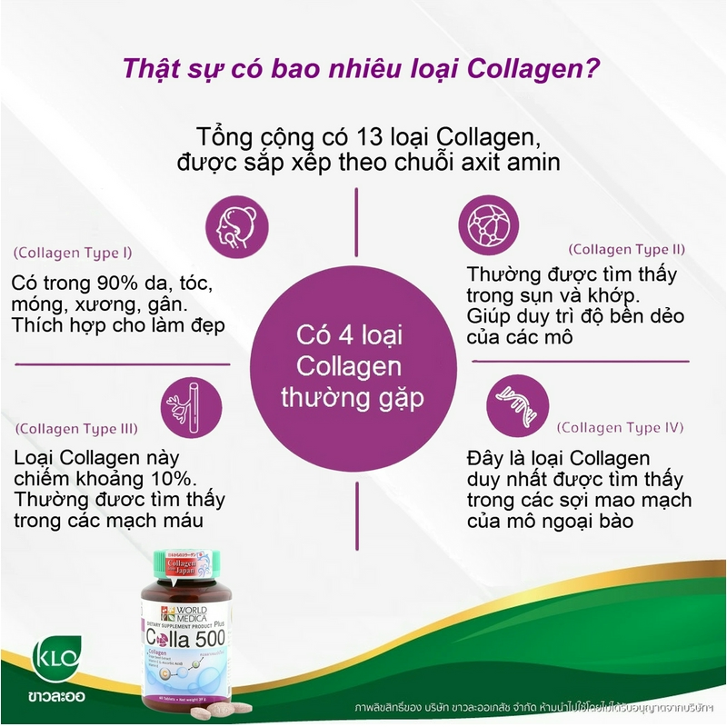 Hiện có 13 loại collagen được nghiên cứu và chứng minh. Loại Collagen quan trọng nhất được tìm thấy ở cơ thể người và động vật là Collagen loại I, II, III và IV.